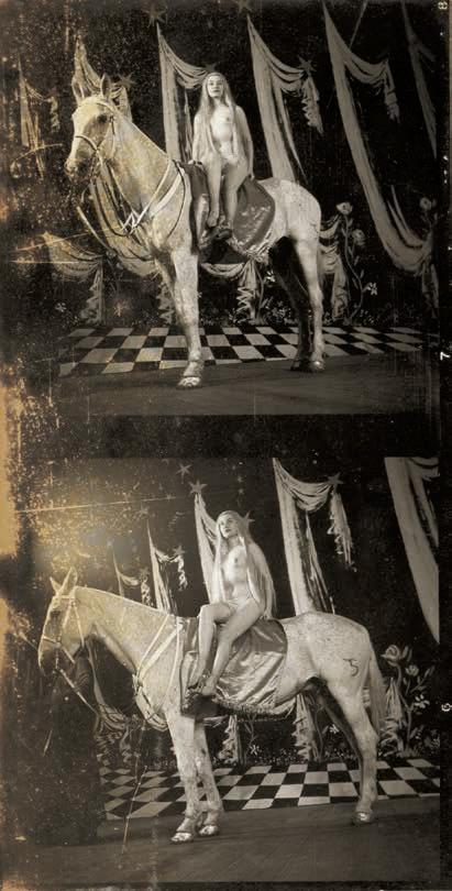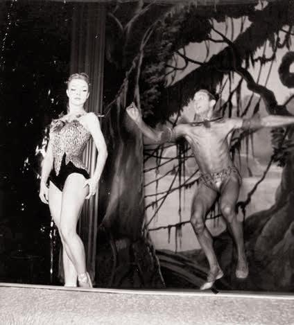 Merece menção o fato de a bailarina ter um papagaio vivo pousado em sua mão (i61), trazendo para o espaço da floresta cenográfica um verdadeiro habitante das matas. Não é novidade a presença de animais em cena no teatro de revista: há registro de um burrico em dois espetáculos de Eugénio Salvador,370 (i65 e i66) e, no arquivo de Walter Pinto, de uma mulher seminua montando um cavalo branco no palco do Teatro Recreio (i67) na revista É do xurupito, de 1957.