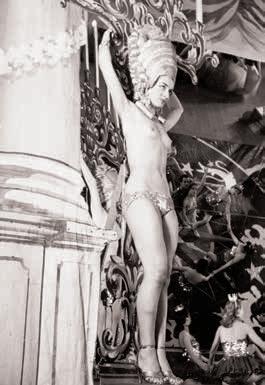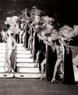 As girls (i94 e i95), seminuas, faziam o ‘ornamento’ do pedestal das grandes luminárias do salão e ficavam em cena, ao que parece, durante toda a segunda fase do quadro, que se passava nesse salão de baile. Na maior parte das fotografias elas aparecem com os braços erguidos; só em uma (i92) seus braços pendem ao longo do corpo, em pose certamente mais confortável, embora menos proveitosa para modular silhueta mais esguia e com seios empinados, que os braços para cima proporcionam. Aqui são parte do cenário, um cenário “vivo” e libidinoso. Essa ideia de ‘mulher-candelabro’ foi verificada em cena de filme musical americano de 1951 (i103), o que pode nos remeter – guardadas as devidas proporções, as distâncias pertinentes e as diferentes relações culturais envolvidas – ao conceito de “iconosfera”, “(o conjunto