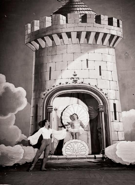 No encontro de D. Juan e Fidalga, a mutação é radical, tanto no cenário como no figurino, que passa a ser a roupa clássica de balé, sem inovação. De acordo com a rubrica do texto, no cenário dessa passagem há algum mecanismo para o efeito de subir e descer Fidalga. A única foto desse momento faz imaginar que o mecanismo do elevador esteja oculto pelos adereços que fazem o trono, em que Fidalga está sentada. Nota-se que a bailarina ainda está alta em relação ao chão do palco, evidenciando, talvez, o momento da descida do trono. E o cenário retrata uma torre, que teoricamente estaria no alto de um castelo, ilusão que se quer proporcionar colocando no palco “nuvens” como adereços cenográficos em torno da torre. Essa manobra cenográfica só pode ser observada graças à fixação do momento da cena pela fotografia, que, sem ter captado os possíveis efeitos de luz e por ser posada, fora da cena em ato, acaba por enfatizar o efeito bizarro de tal objeto ao lado do bailarino, contrastando, então, com a intenção pretendida de um balé nas nuvens.
