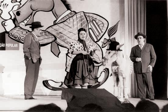 forma, imagens de uma narrativa de fabricação e circulação de mercadorias e indicam a inteligência que está por trás da plasticidade visual das cenas, como no quadro “Bolo real” do sucesso Muié macho sim sinhô, no teatro de revista brasileiro da década de 1950. A fotografia registra e se inclui entre diferentes mecanismos técnicos e artísticos do espetáculo da Companhia Walter Pinto, priorizado no texto devido à dimensão do acervo. Aborda-se, assim, corajosamente o paradoxo entre o excesso de memória do acervo da companhia, doado a instituição pública, e a escassez de escrita historiográfica sobre o empreendimento teatral.