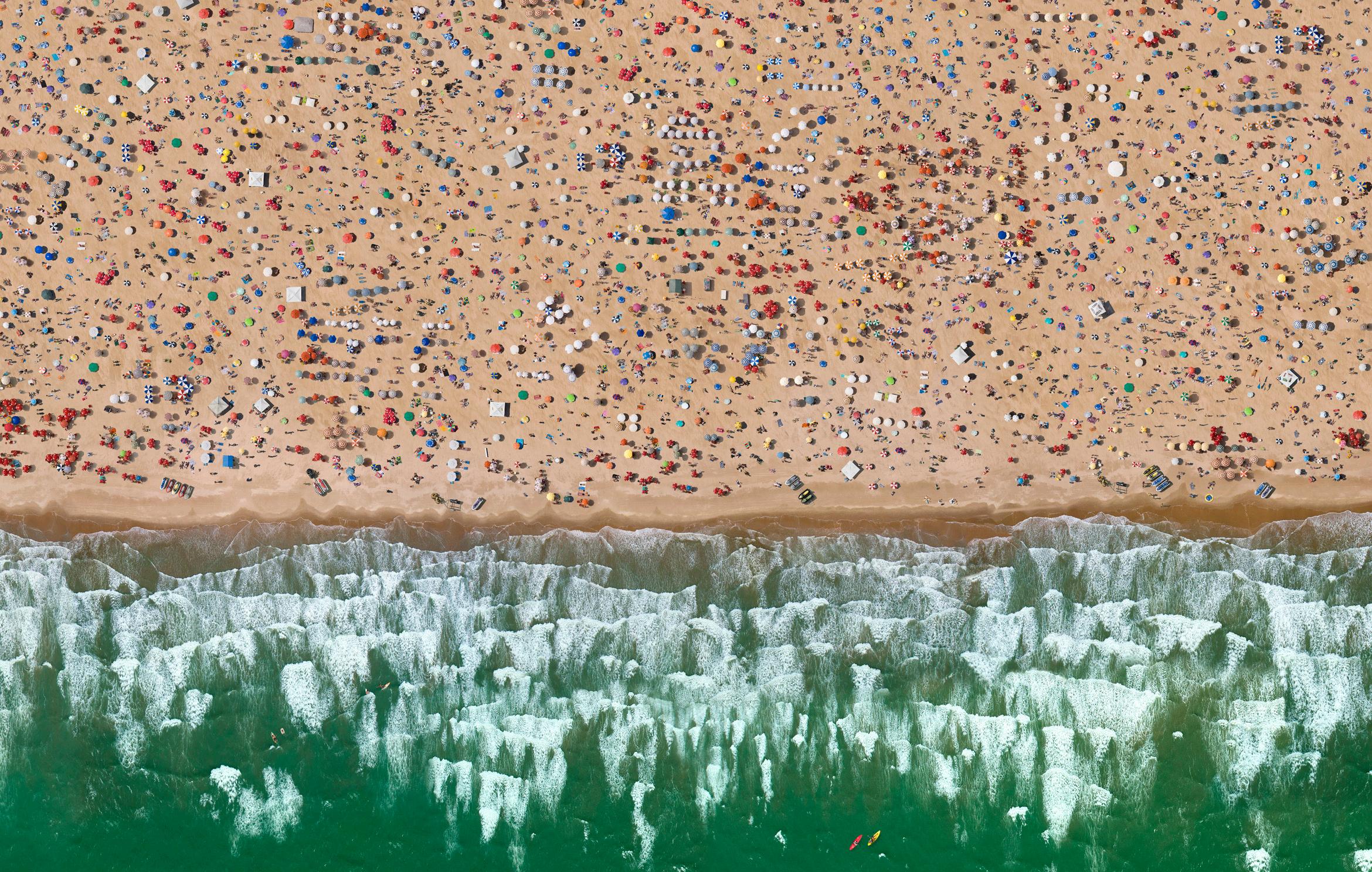 coisas ao mesmo tempo. A da Praia trabalha com isso. É uma praia absurda, se você para pra pensar não pode existir uma praia tão grande e tão cheia, mas ao mesmo tempo existe. Ela não é tão mentirosa assim, se você sobrevoar Copacabana no verão é mais ou menos aquilo, mas eu fiz uma escala muito maior e também, por conta da construção, eu consegui dar uma ilusão de que eu estava muito alto, de uma altura que normalmente não se voa de helicóptero, então tem essa ilusão, tem essa jogo da fotografia. Que, na verdade, a fotografia, mesmo sem intervenção, ela tá sempre questionando o que é verdade e o que não é. O fato de fazer um enquadramento já compromete o real. E isso é uma discussão muito ampla.