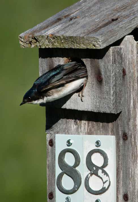 An eastern bluebird perches on the top of a nesting box holding a caterpillar in late May at Fields Pond Audubon Center in Holden. The caterpillar is a meal for the chicks waiting inside the nesting box. (Below) Bird nesting boxes are scattered throughout Fields Pond Audubon Center. PHOTOS COURTESY OF AISLINN SARNACKI Tree swallows are among the most common birds to see using nesting boxes in Maine. PHOTO COURTESY OF AISLINN SARNACKI A tree swallow sticks its head out of a nesting box at Fields Pond Audubon Center in Holden. PHOTO COURTESY OF AISLINN SARNACKI