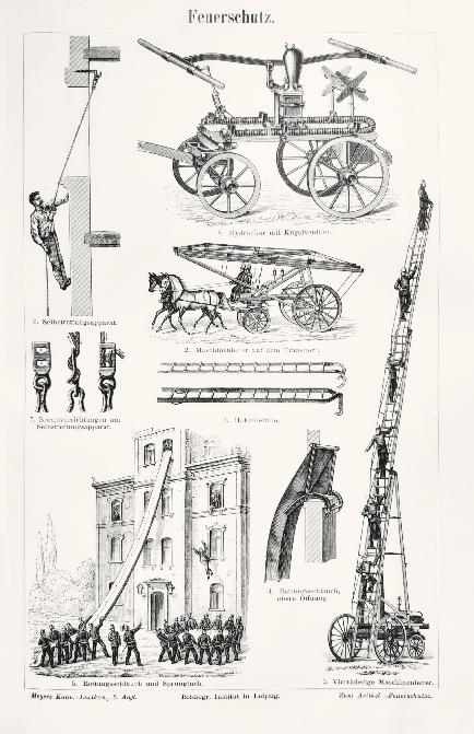 1 Siehe hier und nachfolgend Conversations-Lexikon (Brockhaus). Allgemeine deutsche Real-Encyklopädie, 2. umgearb., verb. und verm. Aufl., Leipzig 1877, S. 486 ff.; Brockhaus’ Konservations-Lexikon. 14. vollständig neubearb. Aufl., Sechster Band: Elektrodynamik – Forum, Berlin/Leipzig/Wien 1894, S. 734–738; Weiser, Carl: Die deutsche Feuerwehr. Handbuch für das gesamte Feuerlöschwesen, Mainz 1855 sowie Magirus, Conrad Dietrich: Das Feuerlöschwesen in allen seinen Theilen nach seiner geschichtlichen Entwicklung in den frühesten Zeiten bis zur Gegenwart, Ulm 1877.