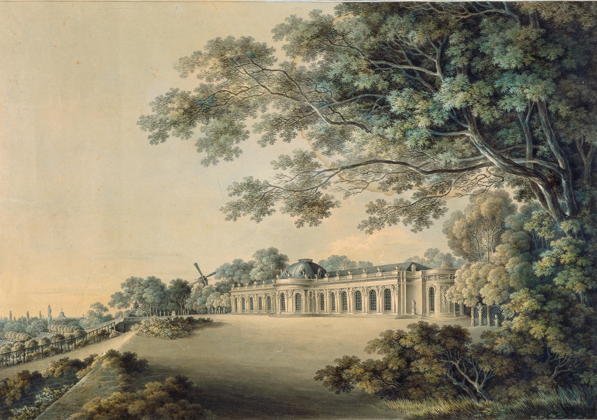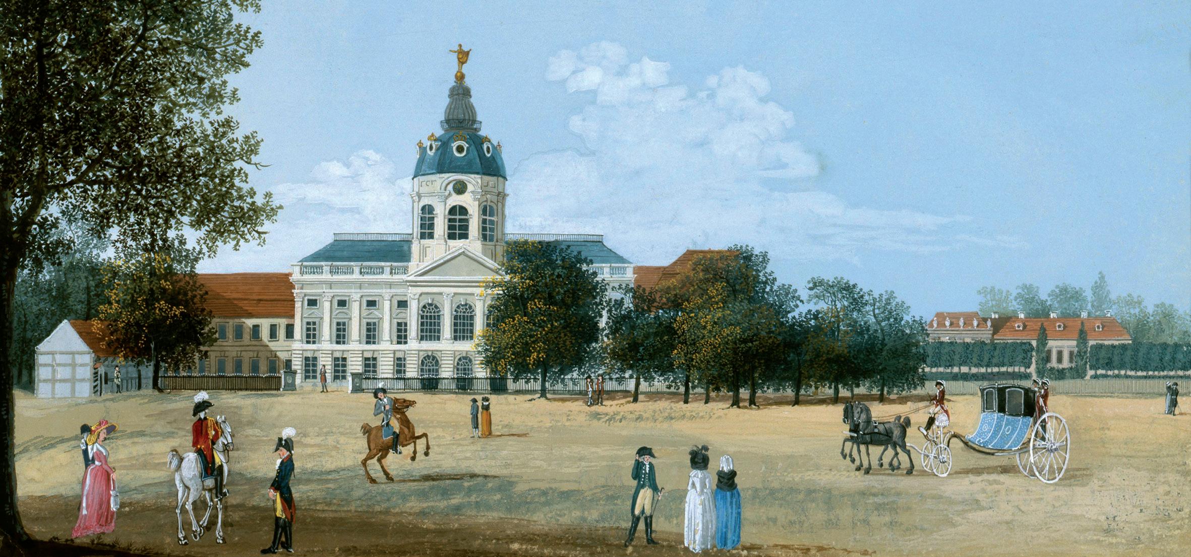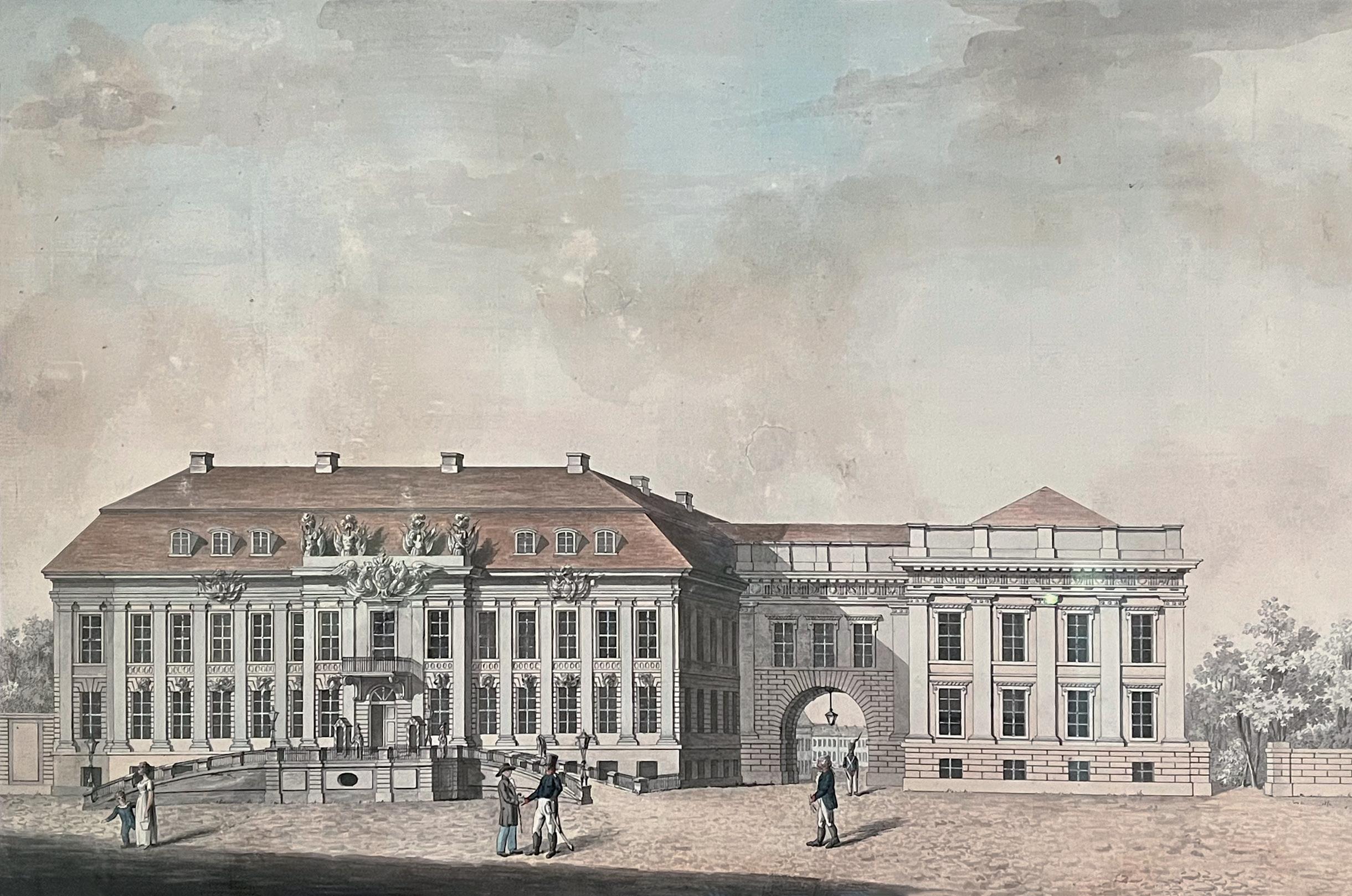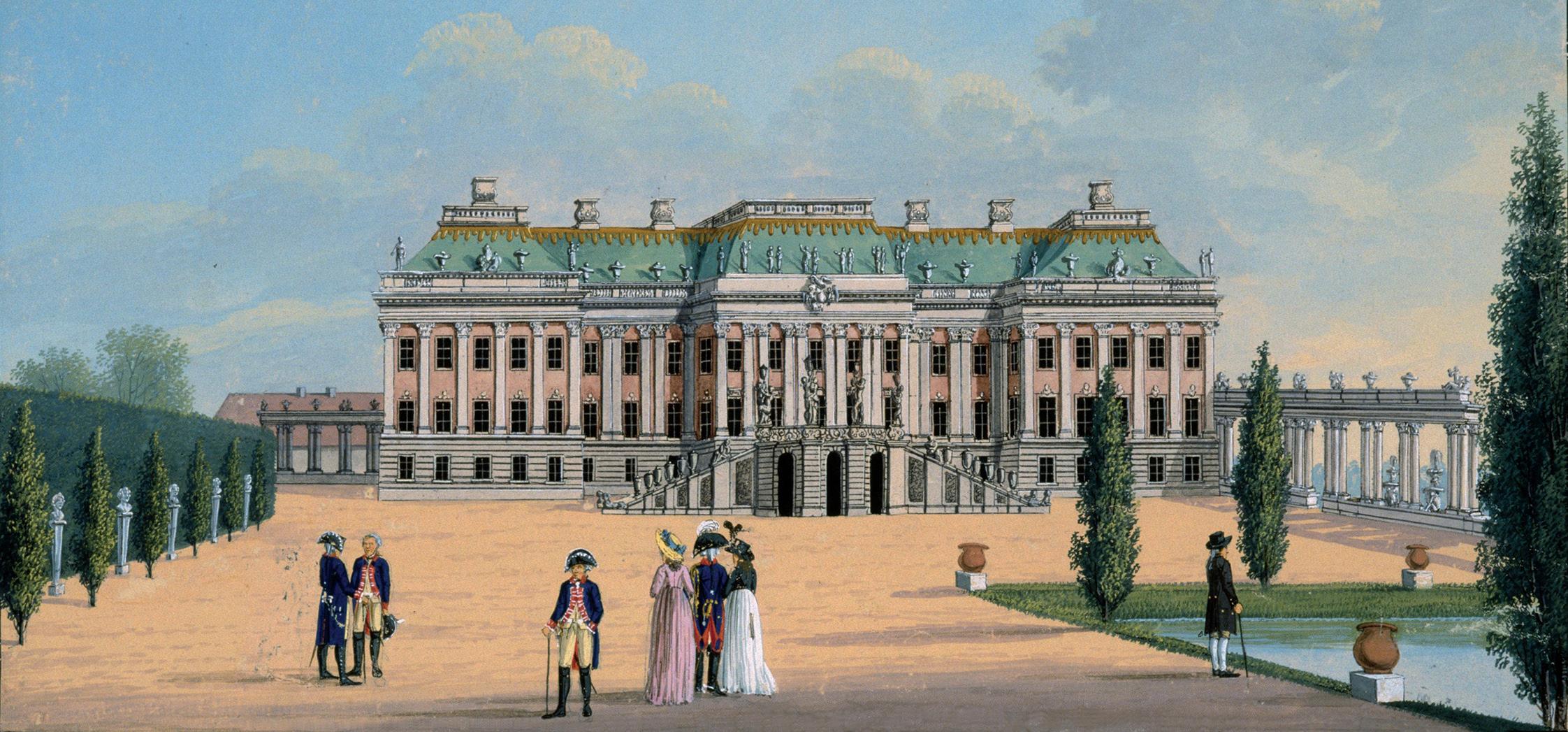 Johann Friedrich Nagel, Schloss Charlottenburg, Deckfarben, 1788. Ganz rechts der von Königin Luise bewohnte
