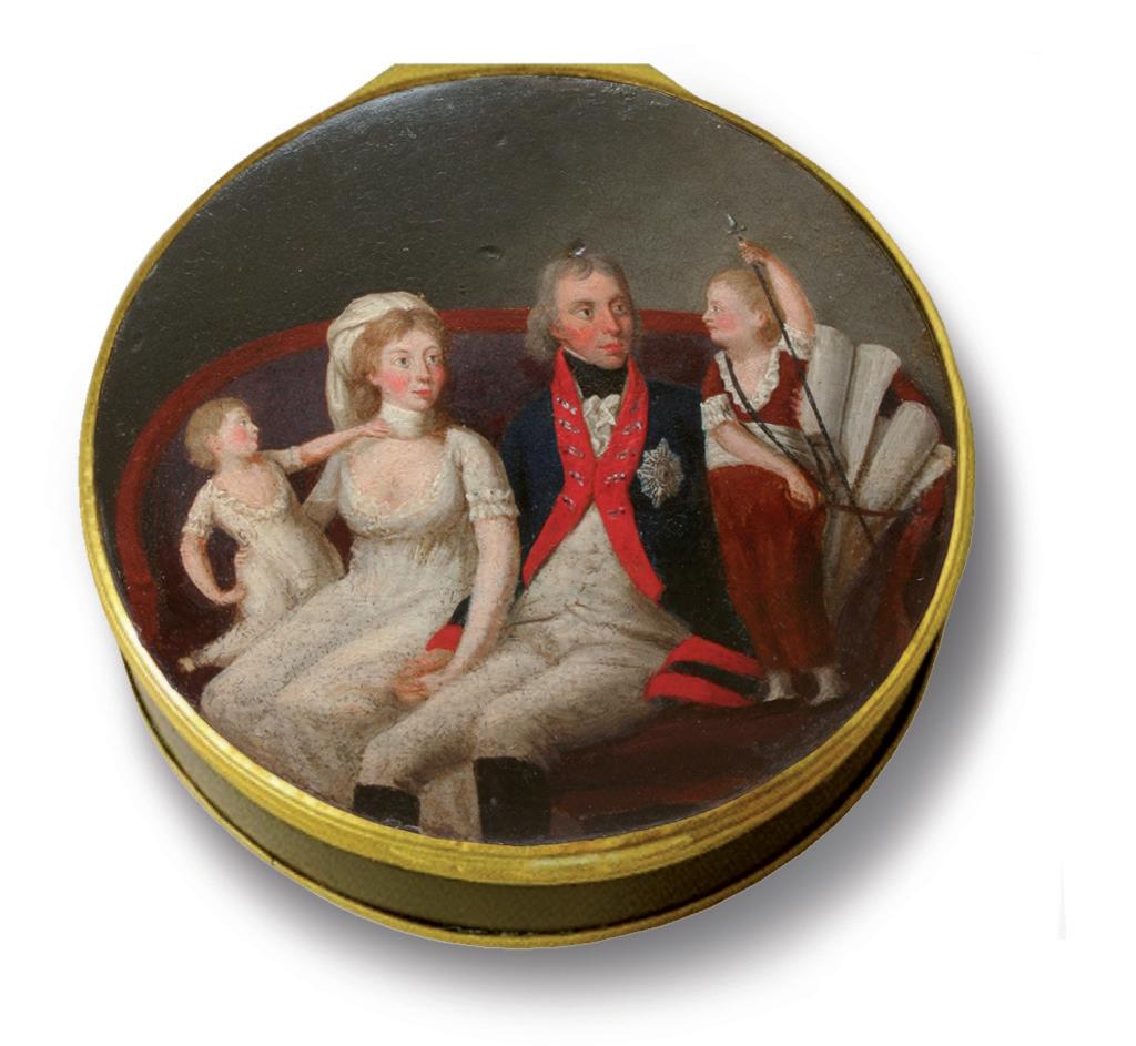 Runde Schnupftabaksdose: Friedrich Wilhelm III. und Königin Luise von Preußen mit zwei ihrer Kinder, vermutlich Friedrich Wilhelm (IV.) und Charlotte, Papier-maché, Lackmalerei, vergoldete Metallmontierung, Manufaktur Stobwasser, Berlin, um 1800