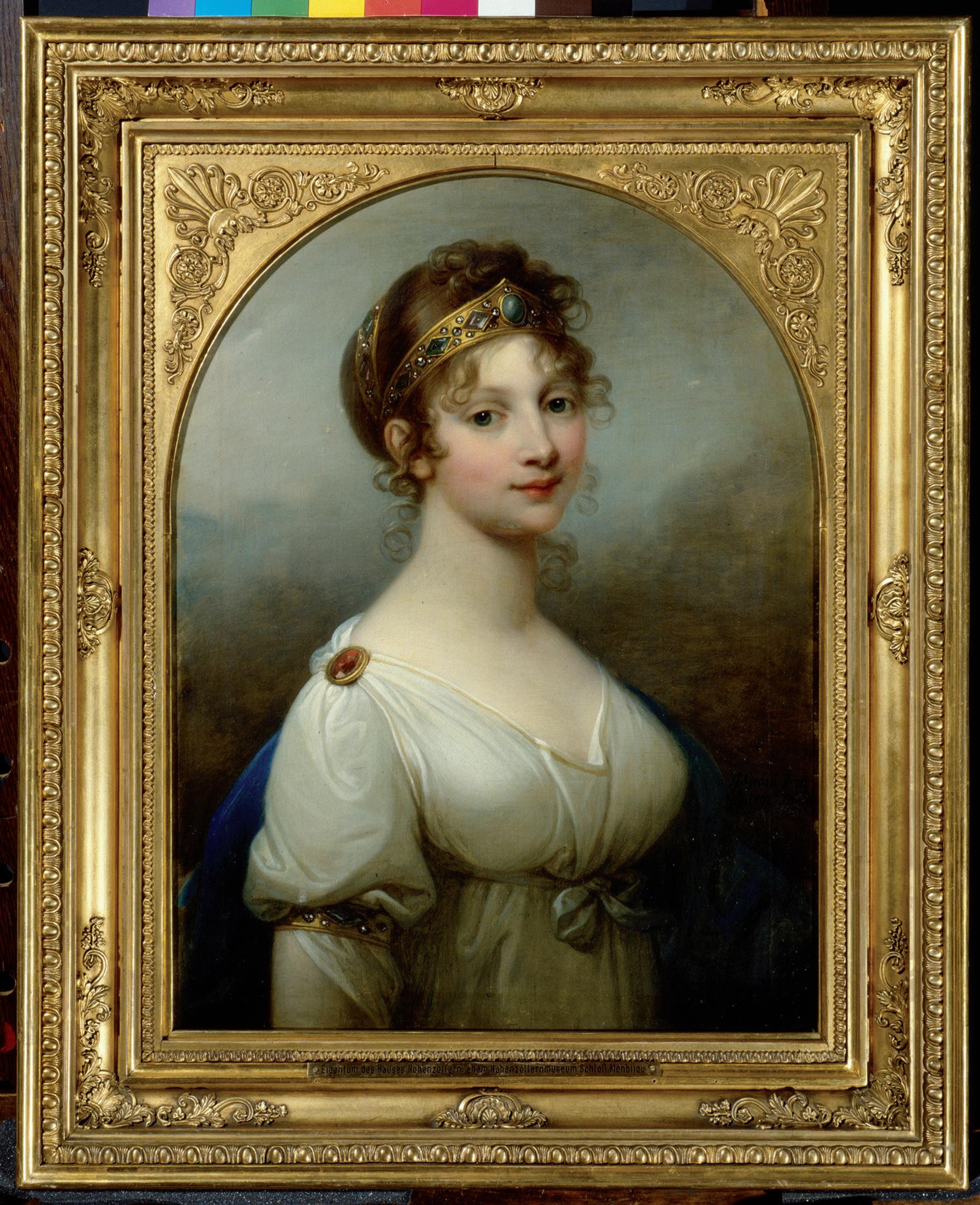 Als Kronprinzessin schmückt Luise, unterstützt von ihrer Schwester, die 1792 von Schadow geschaffene Marmorbüste des Monarchen, der sich für das vorläufige Ende von Preußens Beteiligung am Koalitionskrieg gegen Frankreich eingesetzt hatte, mit einem Olivenkranz. Die „Allegorie auf den Basler Frieden“ wurde bei der Eröffnung der Akademieausstellung am 25. September 1795, dem Geburtstag des Königs, der Öffentlichkeit präsentiert und ihm später als Geschenk überreicht. Eher privaten Charakter hatte dagegen das von Johann Friedrich August Tischbein angefertigte Brustbildnis der Kronprinzessin, das Königin Elisabeth Christine, Witwe Friedrichs des Großen, 1796 erwarb. Das verschollene Porträt und sein wohl als Gegenstück entstandenes Bildnis des Kronprinzen sind nur noch in qualitätvollen Pastellkopien erhalten, die die Malerin Henriette Félicité Tassaert 1798 angefertigt hatte (Bilder S. 20).