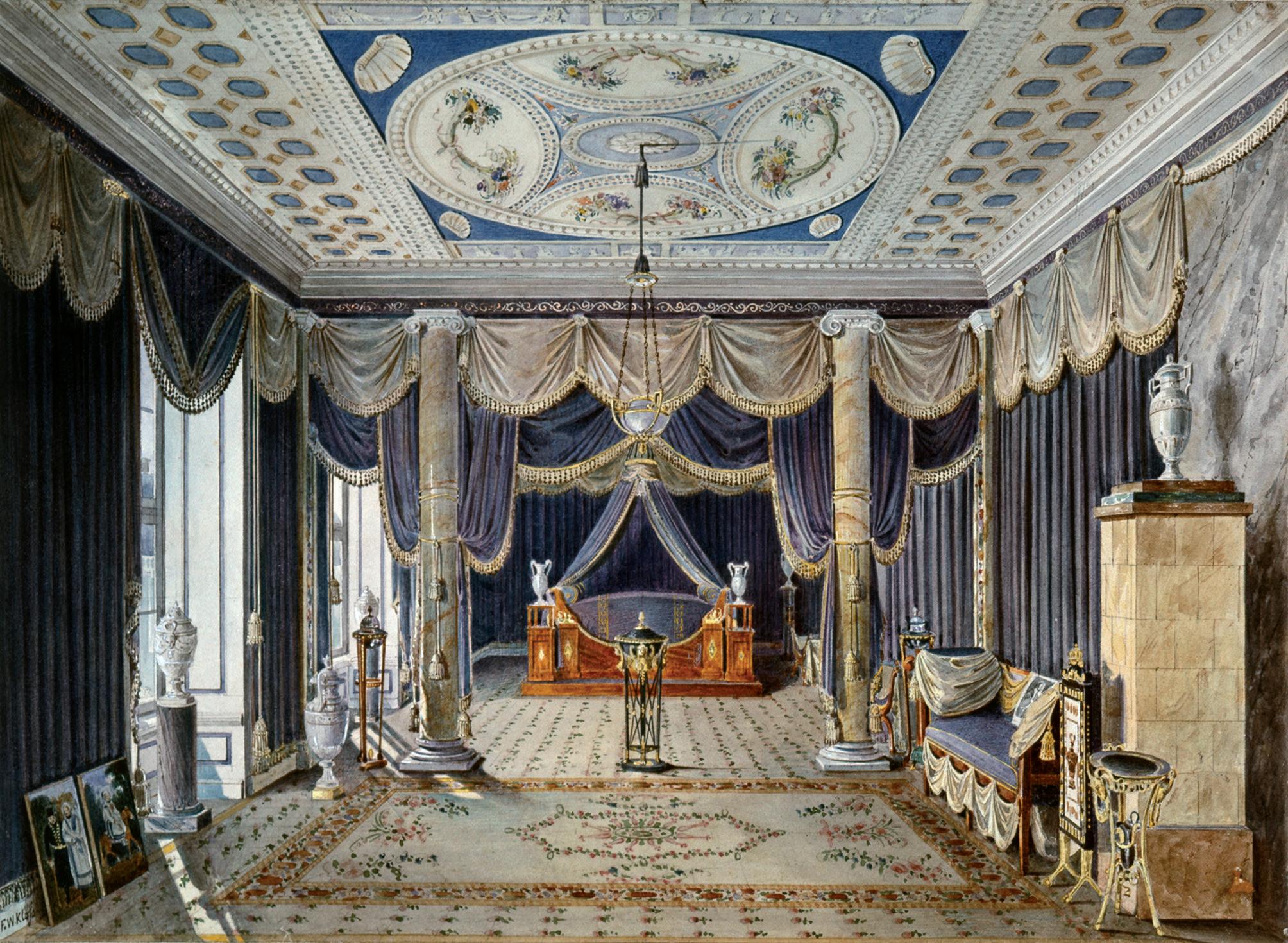 Friedrich Wilhelm Klose, Schlafzimmer der Königin Luise im Königlichen Palais, Aquarell, um 1840
