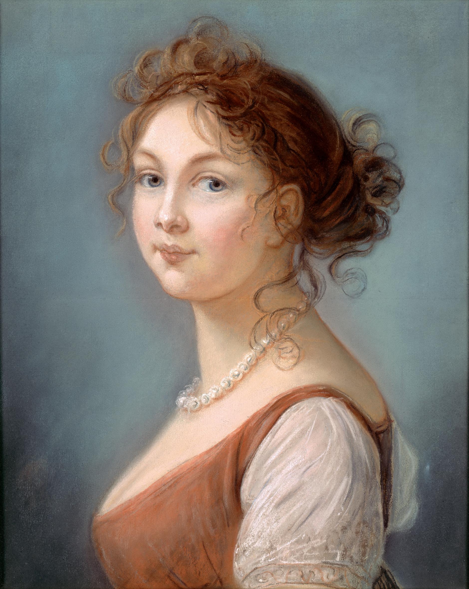 Elisabeth Vigée-Lebrun, Königin Luise von Preußen, Pastellkreide 1801. Die Bildnisstudie verwendete die Künstlerin für ihr 1802 entstandenes repräsentatives Ölgemälde der Königin, das sich heute auf der Burg Hohenzollern befindet (Bild S. 35).