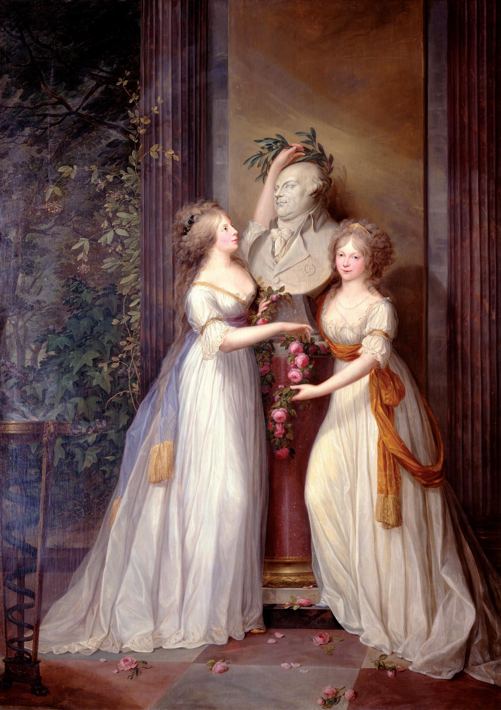 Friedrich Georg Weitsch, Die Prinzessinnen Luise und Friederike von Preußen bekränzen die Büste Friedrich Wilhelms II. –Allegorie auf den Frieden von Basel 1795, Öl auf Leinwand, 1795