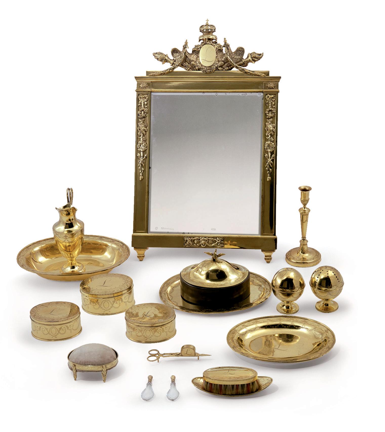 retz präsentiert wird. Es stand auf einem Tisch aus vergoldeter Bronze, dessen kostbare Porzellanplatte von vier vollplastisch geschnitzten Greifen getragen wurde. Von dem ursprünglich 32 Teile umfassenden Service sind 18 erhalten, darunter der Standspiegel, eine Helmkanne mit Lavoir, ein Leuchter, eine Dochtschere, eine Unterschale, ein kleines Gestell mit Nadelkissen, ein ovaler Unterteller, ein Deckel mit Schale, zwei Dosen, eine Bürste und drei ovale Deckeldosen. Zarte Gravuren umschließen auf allen Stücken das weich geschwungene Monogramm der Besitzerin. An der Spiegelbekrönung und auf einem der Deckel weisen Adler auf die königliche-preußische Provenienz.