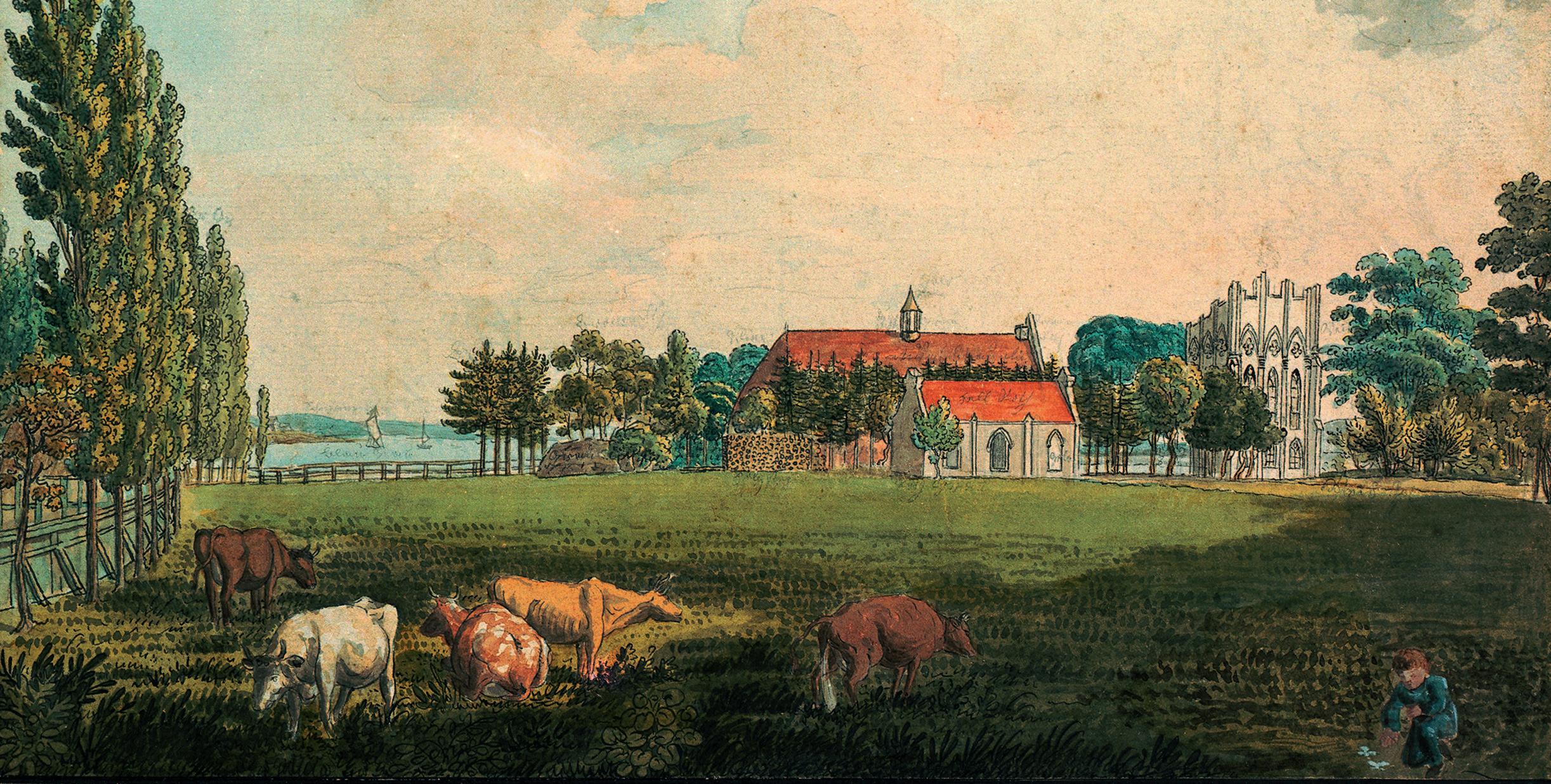 Friedrich Wilhelm Delkeskamp, Meierei, Kuhstall und Remise auf der Nordspitze der Pfaueninsel, Kupferstich koloriert, nach 1801