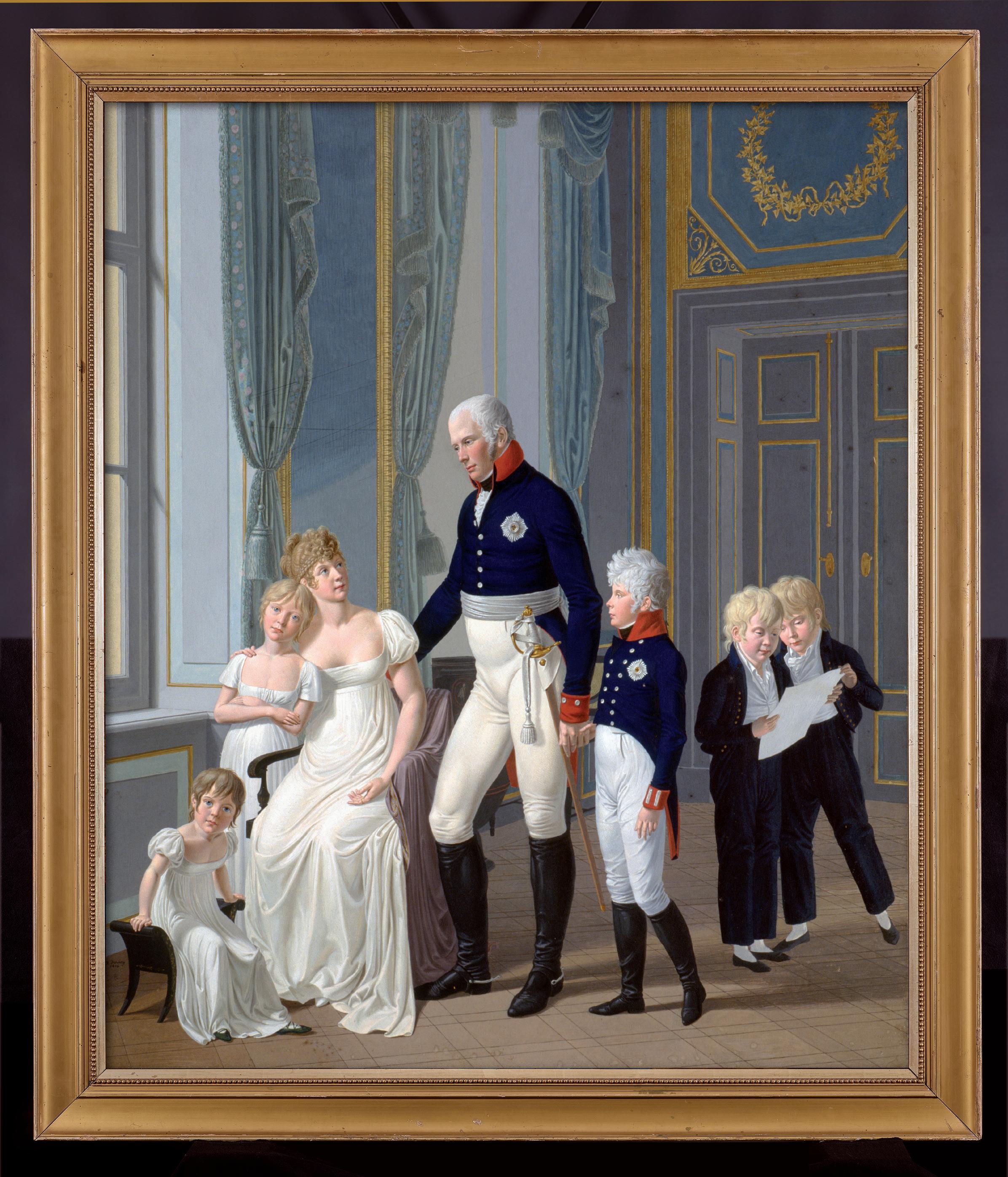 wuchsen nahe bei den Eltern auf. Dies war für den Fürstenstand ebenso ungewöhnlich wie der vertrauliche Umgang des Königspaares miteinander. Daher sah man die Ehe im bürgerlichen Sinn als mustergültig an. Das Familienleben bot ideale Anknüpfungspunkte für die spätere Legende: „Mutterliebe“ habe sie „treu geübt, zum nachhaltigen, weitgreifenden Segen für die eigene Familie wie für Deutschlands glorreiche Zukunft“, hieß es dazu ab 1871 im Kaiserreich. Die Nationalbewussten sahen in Luise gern die fürsorglich-vorausschauende Mutter ihrer beiden ältesten Söhne, der Herrscherbrüder Friedrich Wilhelm IV. und Wilhelm I. Das im preußischen Königshaus ungewöhnlich glücklich anmutende Familienidyll ist von mehreren Künstlern, darunter Heinrich Anton Dähling und Johann Daniel Laurens d. J., überliefert worden. Dählings 1806 entstandene Gouache zeigt eine Begebenheit vom 15. Oktober 1805 im Berliner Königlichen Palais Unter den Linden, als der König seiner Gemahlin den zehnjährigen Kronprinzen Friedrich Wilhelm (IV.) als neuen preußischen Offizier in Uniform vorstellt. Dabei schauen seine jüngeren Brüder Wilhelm (I.) und Carl in das Offizierspatent, während ihre Schwestern Charlotte und Alexandrine bei der Mutter verweilen (Bild S. 12). Als Medium propagandistischer Bildpolitik fanden die Familienporträts in grafischen Reproduktionen weite Verbreitung und wurden selbst auf Alltagsgegenständen wie Fächern und Schnupftabaksdosen verewigt. Von dem innigen Verhältnis Luises zu ihren Kindern zeugen Briefe, in denen sie freigiebig lobte, anspornte und ermahnte. Aus dem Exil im ostpreußischen