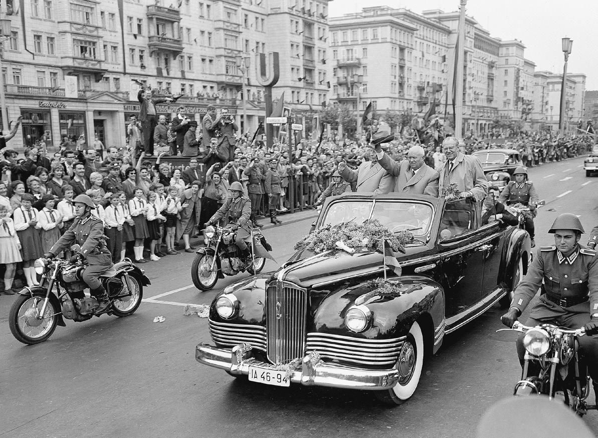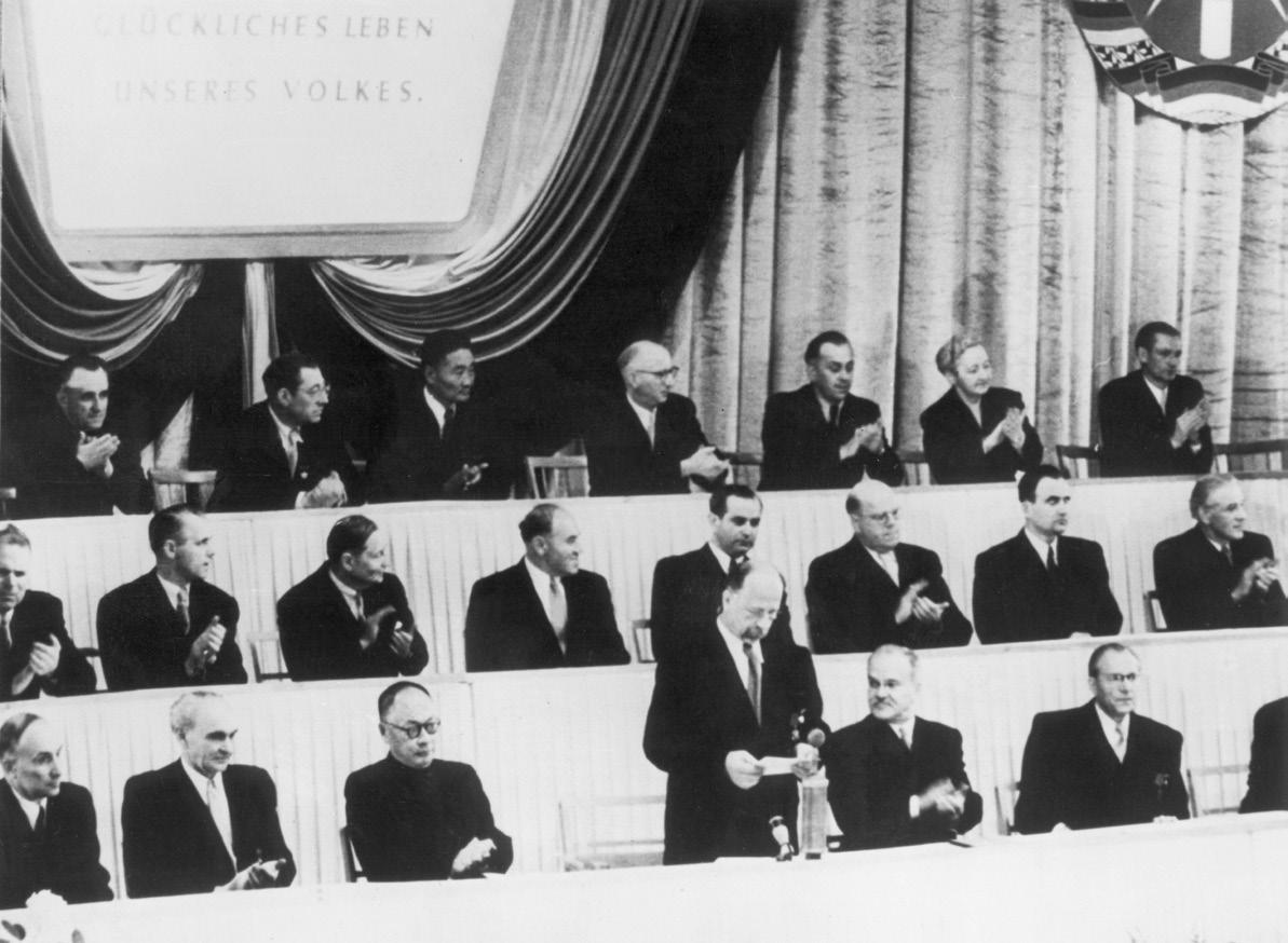 Getrennte Wege: West- versus Ostbindung der »politischen und sozialen Errungenschaften der DDR« abhängig.7 Die sowjetische Zwei-Staaten-Theorie wurde am 20. September 1955 mit dem Vertrag über die Beziehungen zwischen der DDR und der UdSSR kodifiziert. Er bekräftigte ein Verhältnis zwischen beiden Staaten auf der Grundlage »völliger Gleichberechtigung, gegenseitiger Achtung der Souveränität und der Nichteinmischung in die inneren Angelegenheiten«. Die DDR war »frei in der Entscheidung über Fragen ihrer Innen- und Außenpolitik, einschließlich der Beziehungen zur BRD«. Das Amt des Hohen Kommissars wurde aufgelöst. In einem Briefwechsel zwischen den sowjetischen und ostdeutschen Außenministerien behielt sich die Sowjetunion die Kontrolle des alliierten Berlin-Verkehrs und Entscheidungen gegenüber Deutschland als Ganzem und Berlin vor. Mit der »Konsultationspflicht in allen wichtigen Fragen« stellte der Kreml sicher, dass die DDR-Regierung den sowjetischen Vorgaben Folge leistete.8 Die sowjetische Deutschlandpolitik beschränkte sich in der Folgezeit darauf, die Walter Ulbricht (stehend) am 7. Oktober 1954 beim Festakt zum 5. Jahrestag der Gründung der DDR in Ost-Berlin.