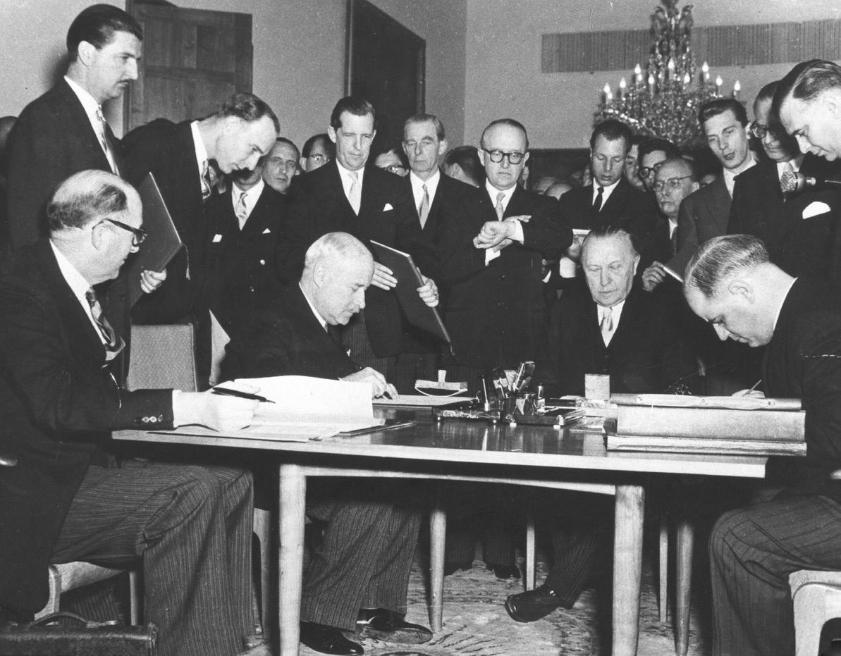 Am 26. Mai 1952 wurde in Bonn der Generalvertrag zur Ablösung des Besatzungsstatuts und am folgenden Tag in Paris der Vertrag über die Europäische Verteidigungsgemeinschaft (EVG) nebst Zusatzprotokollen und ergänzenden Schriftwechseln unterzeichnet. Nachdem die französische Nationalversammlung am 30. August 1954 mit 319 zu 261 Stimmen den EVG-Vertrag von der Tagesordnung abgesetzt hatte, musste ein anderer Weg gefunden werden, um das zentrale Anliegen der bundesdeutschen Europapolitik, die wirtschaftliche Integration mit ihrer militärischen Ergänzung unter dem Dach einer bundesstaatlich organisierten Europäischen Politischen Gemeinschaft (EPG) unterzubringen. Als Ersatzlösung verständigten sich die Teilnehmer der Londoner Neunmächte-Konferenz (28. September bis 3. Oktober 1954) auf die Weiterentwicklung des Brüsseler Pakts vom 17. März 1948 zu einem kollektiven europäischen Sicherheitssystem, der Westeuropäischen Union (WEU). Es folgte eine »Monsterveranstaltung von vier ineinander verschachtelten Konferenzen« (Hans-Peter Schwarz) vom 20. bis 23. Oktober 1954 in Paris. Die Mitglieder des Brüsseler Pakts stimmten einer Aufnahme der Bundesrepublik und Italiens in den auch funktional erweiterten Brüsseler Pakt zu. Als Ergebnis ihrer Gespräche verständigten sich die drei Westmächte