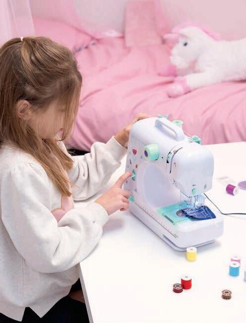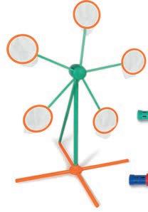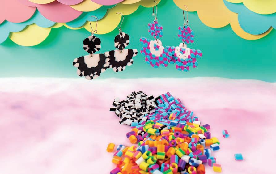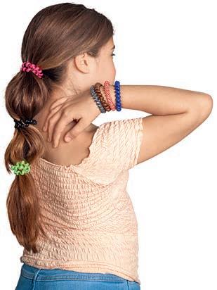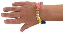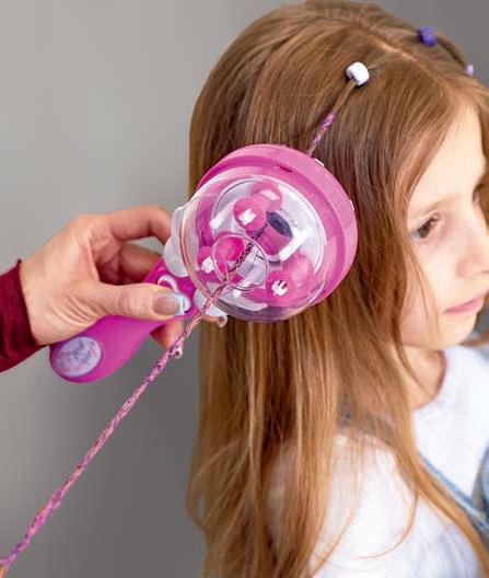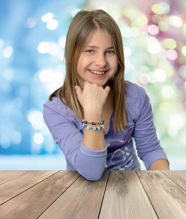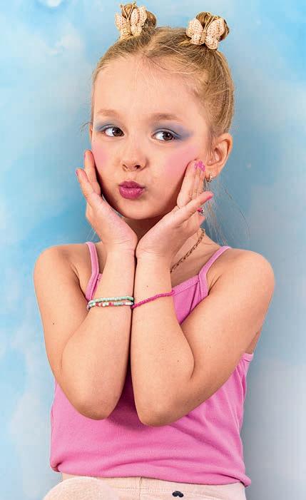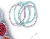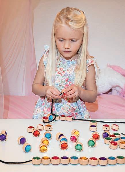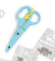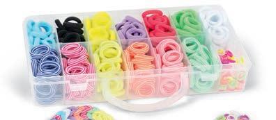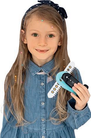 gummistangen Länge ca. 3 – 4,5 cm, Ø ca. 0,4 – 1,8 cm, Schneide Station 13 x 7 x 18 cm, Stanzer Station, Auffädelhilfe, 2 Auffädel-Gummischnüre, Nagelsticker und Anleitung. Ab 3 Jahren.