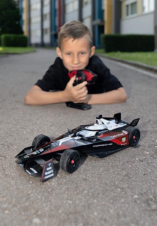 4 R/C Porsche Formula E 1:14 Rennspass wie auf der Formel-E-Strecke: Das RC-Modell überzeugt durch starke Optik, einfache Steuerung und robustes Material. Mit 2,4-GHz-Technik für störungsfreie Rennen auch mit mehreren Fahrzeugen gleichzeitig. Aufladbarer Akku im Fahrzeug, Reichweite bis 20 Meter. Fernbedienung batteriebetrieben. Ide-
