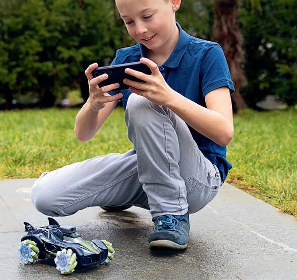 Erlebe actiongeladenen Fahrspass mit dem ferngesteuerten Stunt-Auto inkl. 1080p HD-Kamera mit Echtzeitübertragung und Aufnahmefunktion. Steuere es per Smartphone oder 2,4-GHz-Fernbedienung, nutze die GravitationssensorSteuerung und geniesse 360°-Drehungen mit Beleuchtung und Musik. Grösse 23 x 15,5 x 11 cm. Reichweite: 25 m. Lieferung inkl. batteriebetriebener Fern-