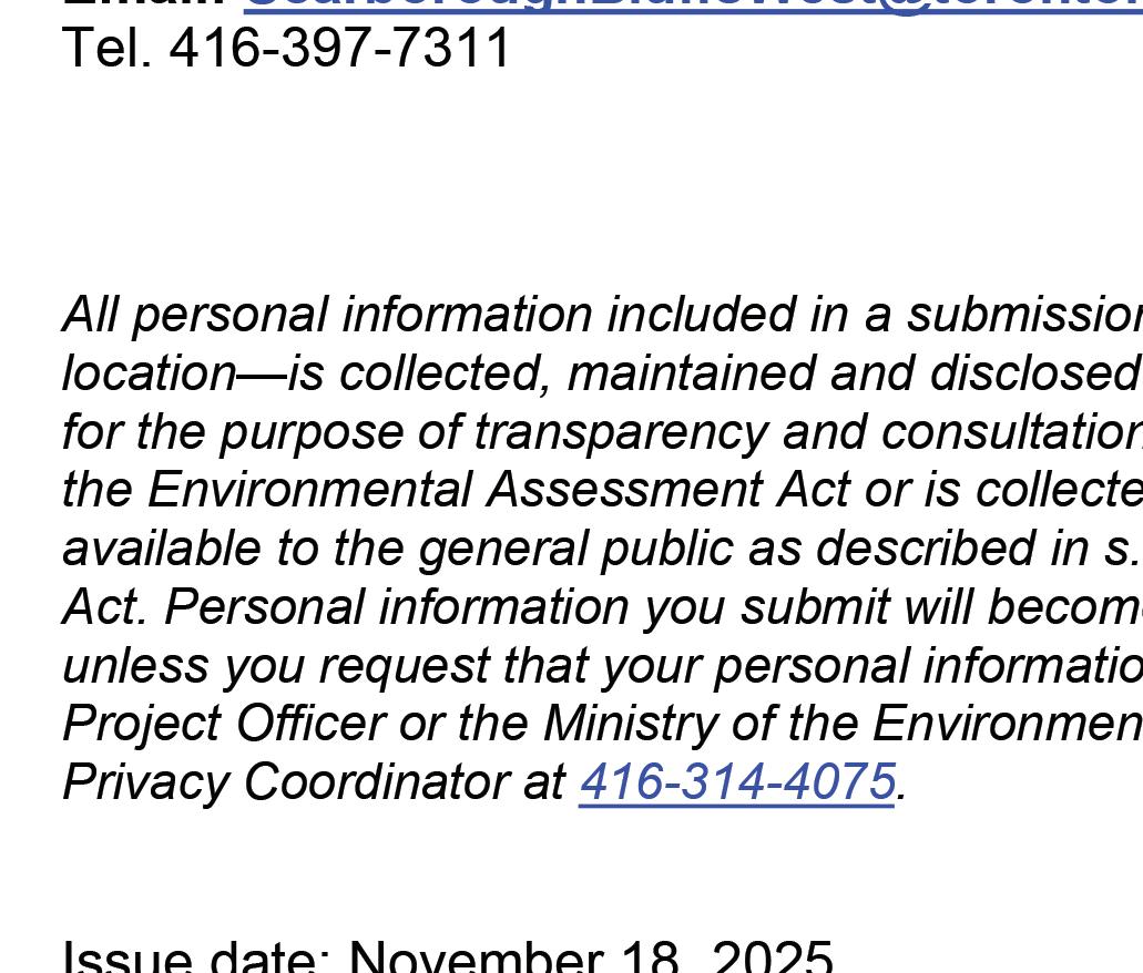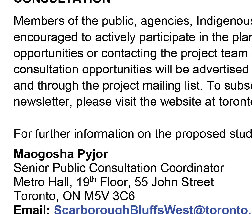 Thursday’s meeting will take place at the West Scarborough Neighbourhood Community Centre (313 Pharmacy Ave., Activity Room 1 and 2) from 7 to 8:30 p.m. During the meeting, members of the public will have an