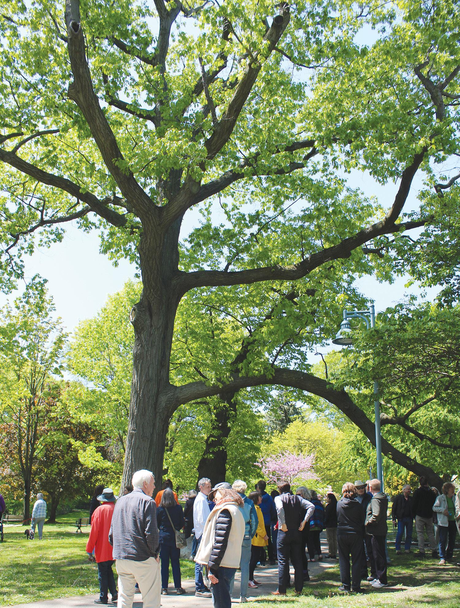 A celebration was held last Thursday, May 25, to celebrate the unveiling of a Heritage Toronto plaque designating the giant red oak tree in Kew Gardens as a Forests Ontario Heritage Tree. Photo above, The Beach and East Toronto Historical Society members (from left) Erik Malmsten, Gene Domagala, Mary Campbell, Julita Tyszewicz, Barbara Myrvold, Glenn Chadwick and Birgit Siber at the unveiling.