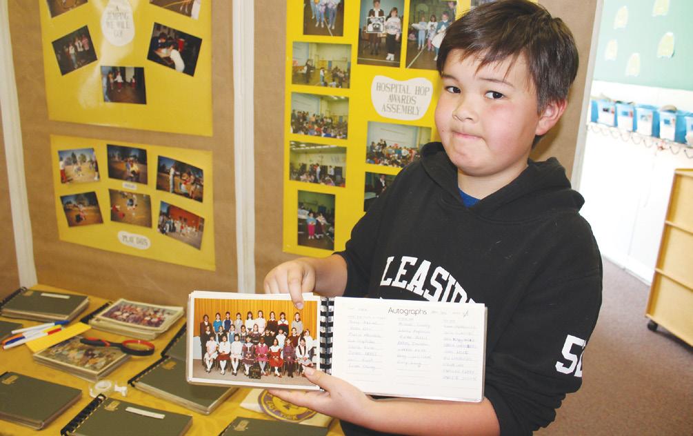R.H. McGregor Elementary School in East York celebrated its 100th anniversary with an Open House on Saturday, May 27. Photo above left, Kelly Vandette, Flory Ball and Michelle Spencer catch up on their memories of attending the school in the 1970s. Photo above right, current McGregor student Koah Cowan-Ishihara points to a photo of his uncle Stewart Cowan who attended the school in 1984.