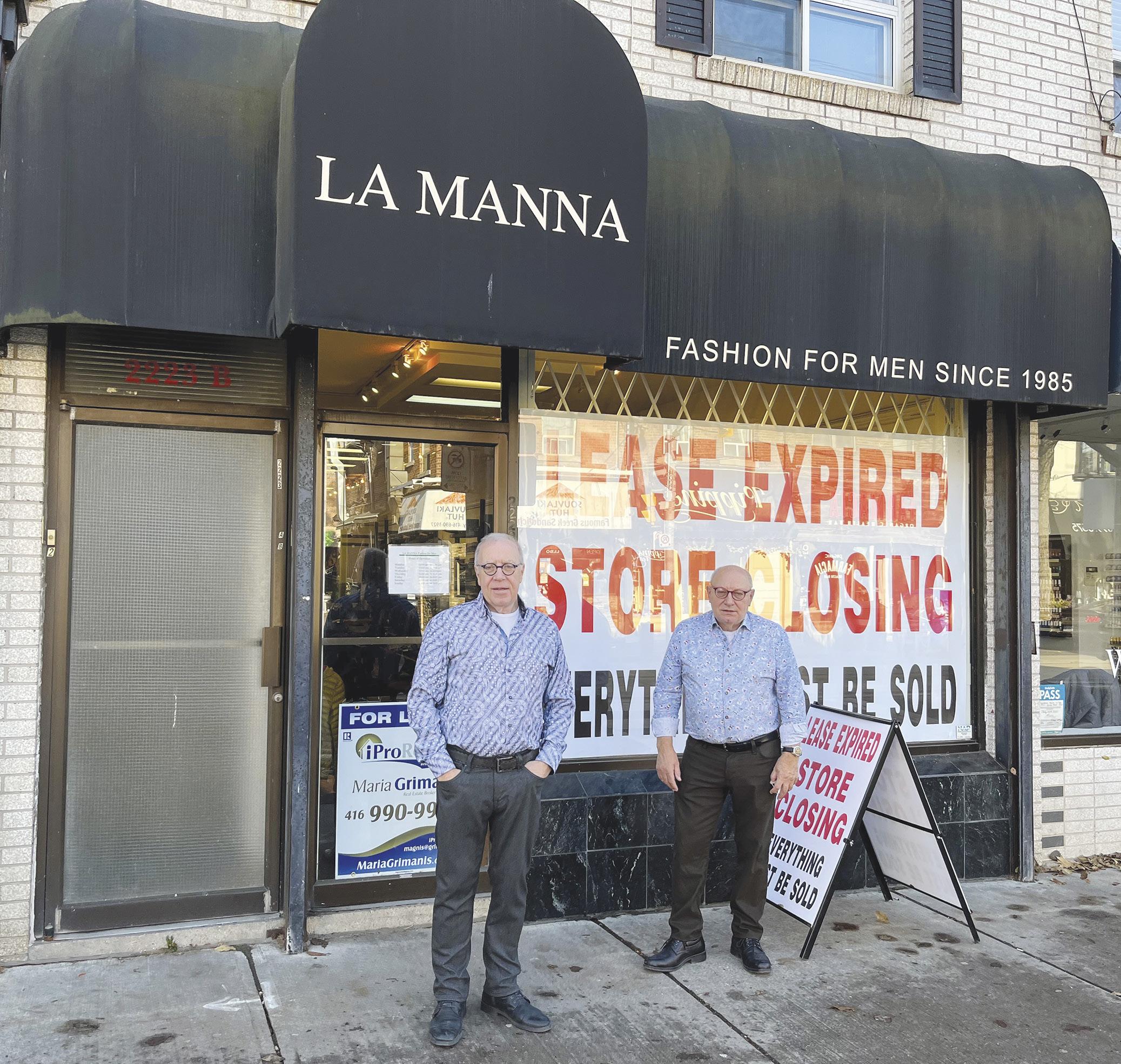 Mario and Angelo La Manna in front of La Manna’s Fashion for Men on Queen Street East in the Beach. The store is closing at the end of December after what has been 38 years of business in the community.