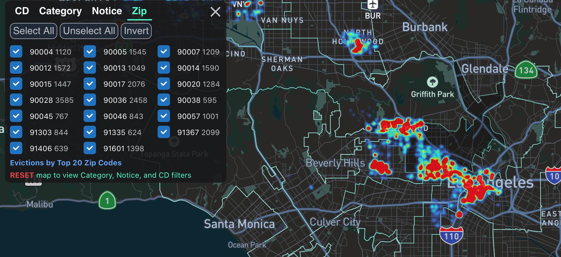 The top three zip codes in which eviction filings were received were 90028 Hollywood with 3,585 notices, 90036 Fairfax with 2,458 evictions and 91367 Woodland Hills with 2,099 notices.