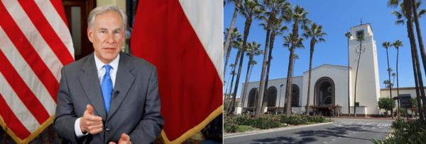 Texas Gov. Greg Abbott and Union Station. | Photos courtesy of Gov Greg Abbott/YouTube; David Wilson/Wikimedia Commons (CC BY 2.0)