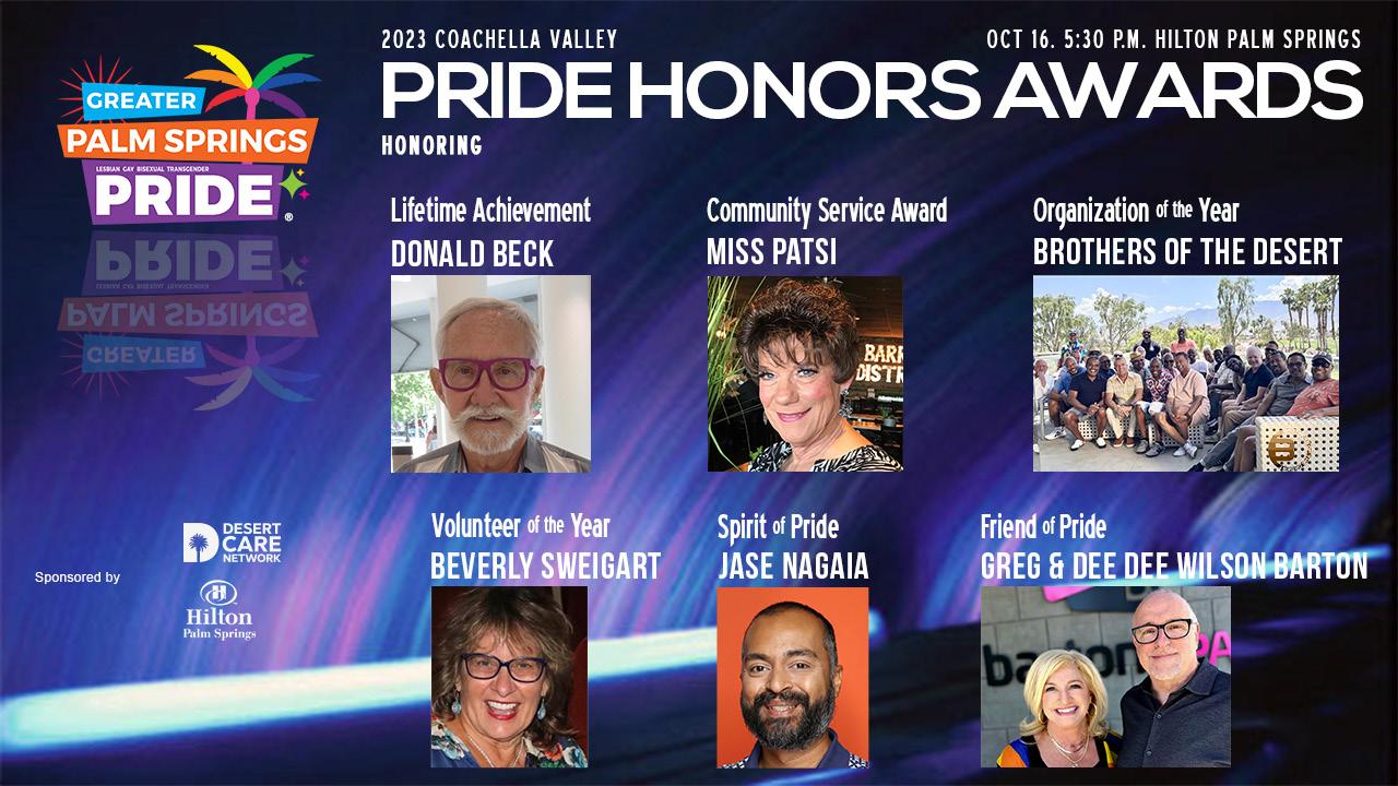 Greater Palm Springs Pride on Tuesday announced six individuals and one organization who will be honored at the annual Pride Honor Awards next month.