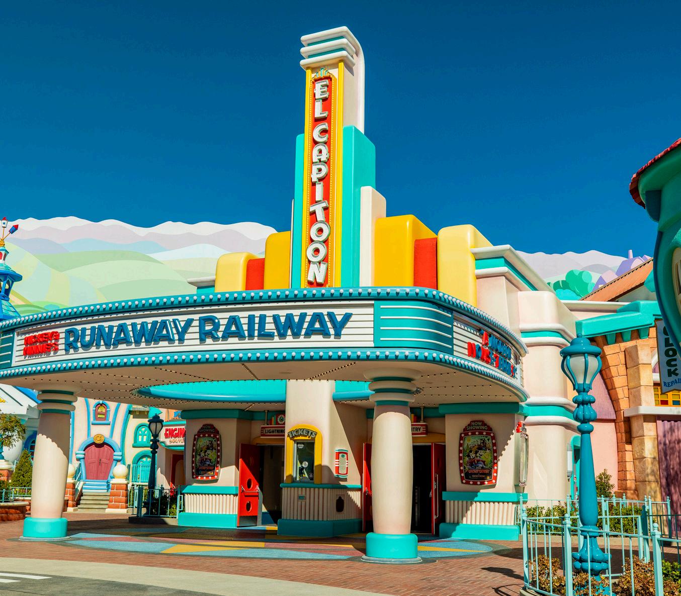 The attraction begins at the “El CapiTOON Theater,” a pun on the Disney-owned El Capitan Theatre on Hollywood Boulevard, where Mickey & Minnie’s Runaway Railway transports guests into what is billed as “the wacky and unpredictable cartoon world of Mickey Mouse and Minnie Mouse, where they board a train engineered by Goofy and embark on a zany, out-of-control adventure with surprising twists and turns.”