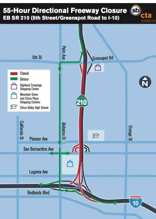 Friday, crews began a series of six directional, 55-hour freeway closures on SR 210 as part of the SR 210 Lane Addition and Base Line Interchange Project. These closures will continue one direction at a time over select weekends. The closures will allow crews to safely perform paving operations on eastbound (EB) and westbound (WB) SR 210 at the on and off-ramp junctures of the San Bernardino Avenue interchange.