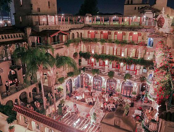 The nightly fest features the century-old inn bathed in multi-colored hues, with hundreds of animated characters, including elves, toy soldiers, nutcrackers and angels, visible on banisters, balconies and ledges.