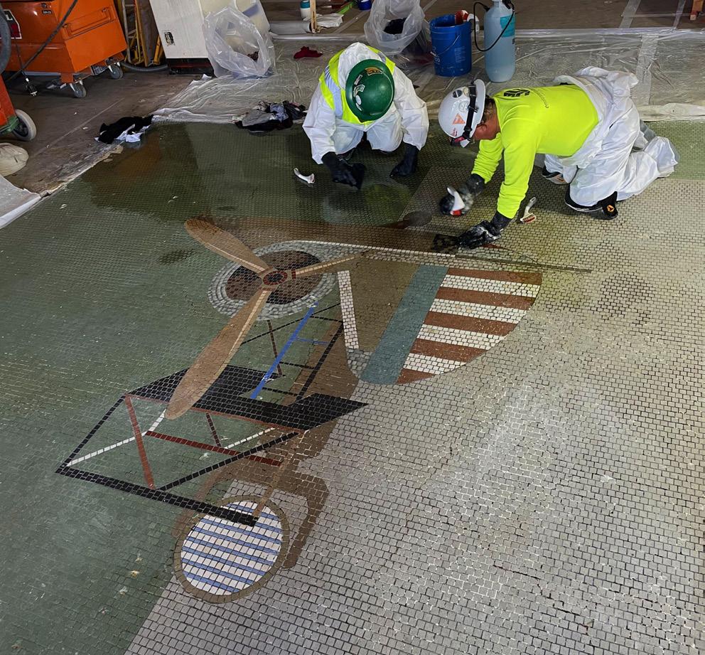 The majority of the mosaic tiles cover about 4,300 square feet on the Historic Terminal’s first floor, but the artwork also extends up the staircases to a vignette on the upper level, officials said. In the 1960s to reduce noise in the bustling terminal, the mosaic art was covered with carpeting, vinyl and other types of flooring. The mosaic