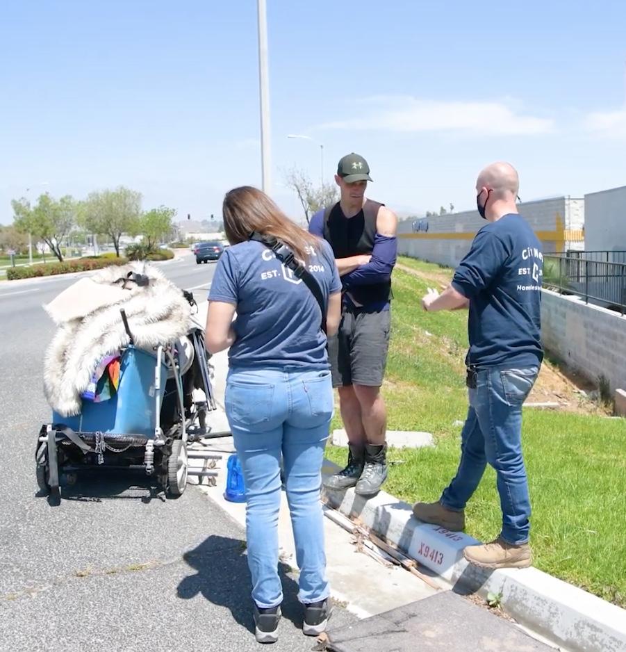 A member of Riverside’s homeless outreach team speaks with two people at an encampment. Riverside homeless outreach workers interview an unhoused man. | Photo courtesy of the city of Riverside/YouTube
