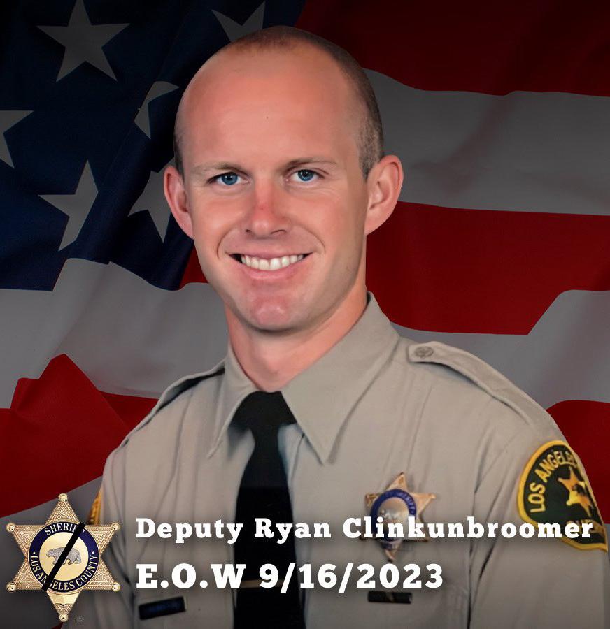 Deputy Ryan Clinkunbroomer, 30, was shot around 6 p.m Saturday while sitting in his patrol car near the station at Sierra Highway and East Avenue Q. Sheriff's officials said a good Samaritan stopped to render aid after the shooting and the wounded deputy was taken to Antelope Valley Medical Center in grave condition. He was pronounced dead that night.
