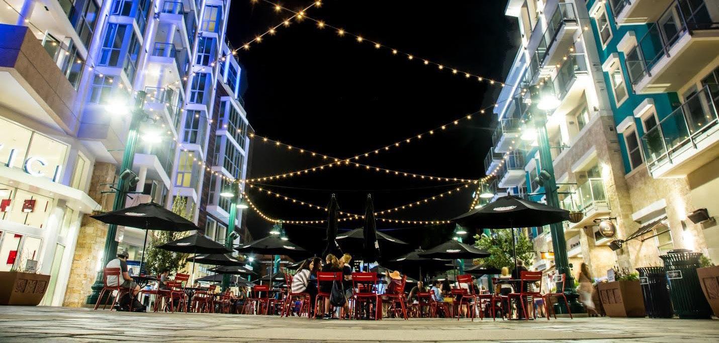 piazzas that mirror European public spaces for people to sit at and relax in. Piazza della Famiglia, the largest at 10,000 square feet, is one particularly wonderful place to explore. People can sit there and have a glass of prosecco or a cocktail while they enjoy a view of the San Diego Bay, the weather, and the sound of people in that space. You can grab lunch or dinner at one of our local restaurants. There are multiple retail stores and galleries people can enjoy. We also have the Music Box, which is an entertainment venue where you can watch a concert.”