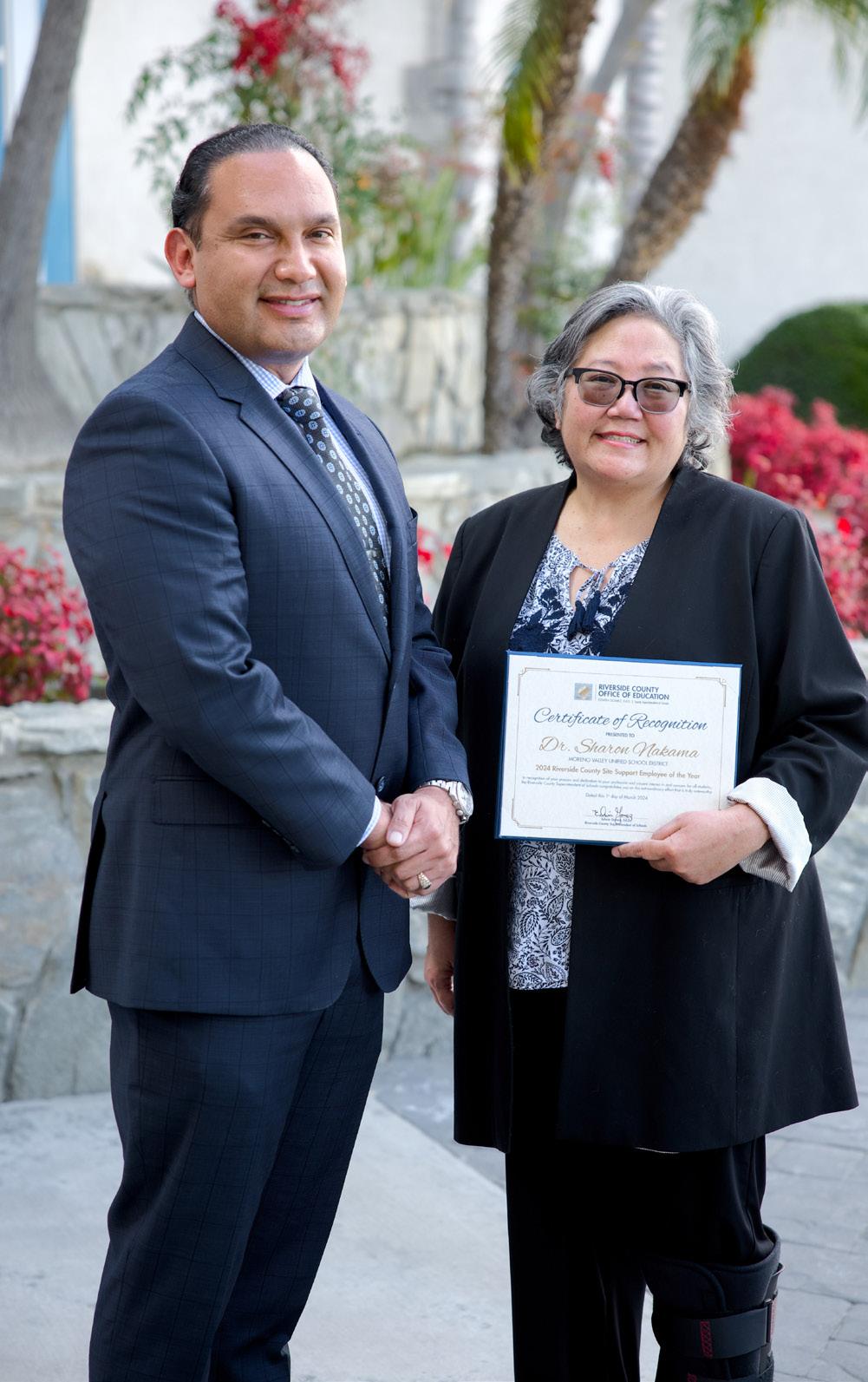 The full panel of 2024 honorees is: Principal of the Year Emily Price from Megan Cope Elementary School in the San Jacinto Unified School District; Confidential Employee of the Year Cindy Vasquez, executive assistant at Jurupa USD; Certificated Administrator of the Year Ryan Mulvanny, director II of professional development and learning at Lake Elsinore USD; Site Support Employee of the Year Sharon Nakama, coordinator of special education at Moreno Valley USD; Classified Administrator of the Year Michael Sattley, director of facilities services at Hemet USD; Classified Employee of the Year Michelle Forcina, secretary III at Canyon Springs High School, Moreno Valley USD; and School Counselor of the Year Gabriella S. Zlaket from Arlington High School, Riverside USD.