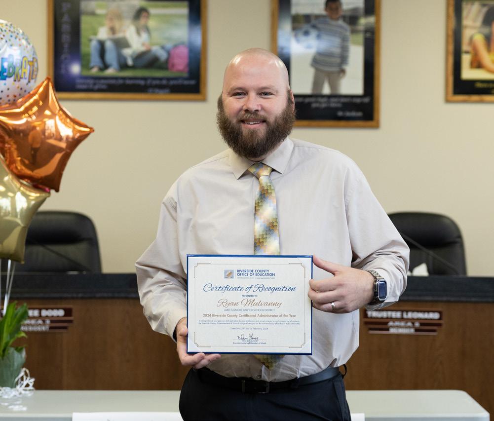 Elsinore Unified School District's board room, according to the Office of Education. He entered to a warm greeting from family, colleagues and, of course, Gomez, from whom Mulvanny got the news that he is the county's 2024 certificated administrator of the year.