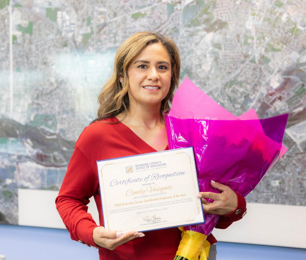 On a Thursday afternoon in late February, under the guise of needing technology support for a meeting, Jurupa Unified School District executive assistant Cindy Vasquez was called to a conference room. Waiting for her there were colleagues, educators and the superintendent — all poised to celebrate the news that she is the 2024 confidential employee of the year.