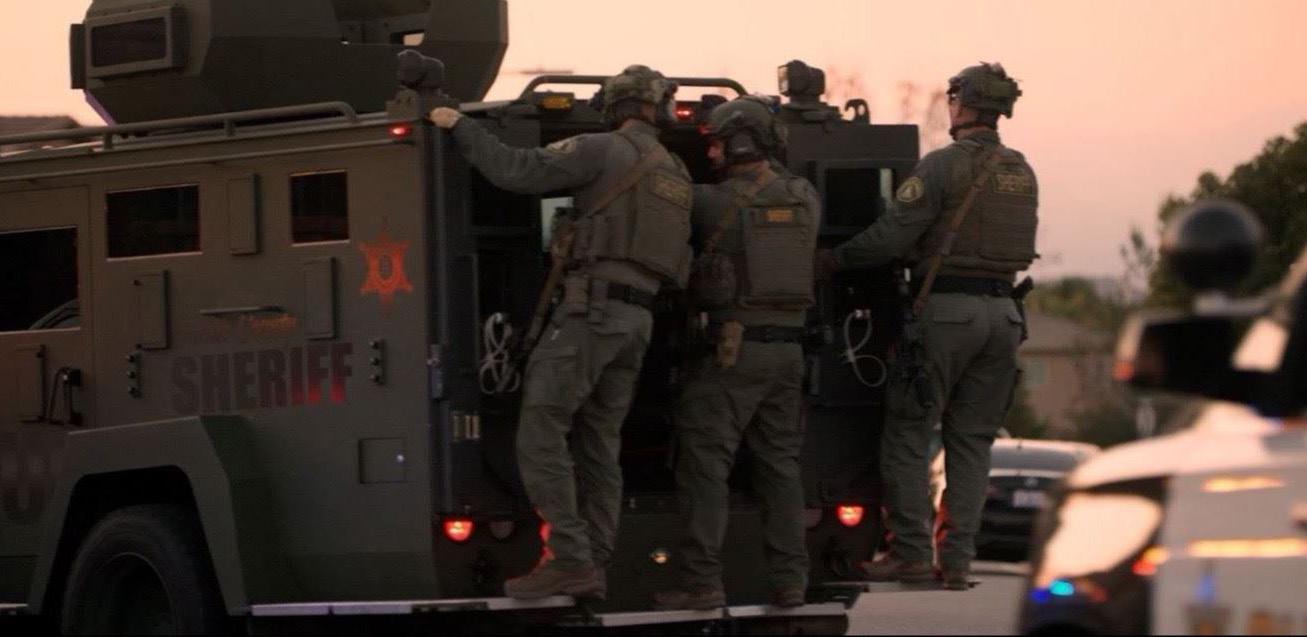 | Image courtesy of the Riverside University Health System Special Enforcement Bureau officers stand on the edge of an armored vehicle. | Photo courtesy of the Riverside County Sheriff’s Department