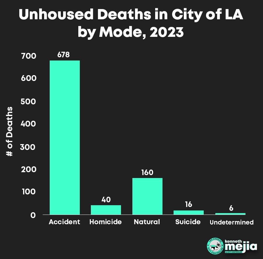 Highlights of the controller's analysis showed that the most common mode of death was categorized as an "accident" (about 678 deaths or 75%). About 40, or 4%, homeless people were murdered in 2023, accounting for 12% of all homicides in the city. Unhoused people represent about 1% of the population.