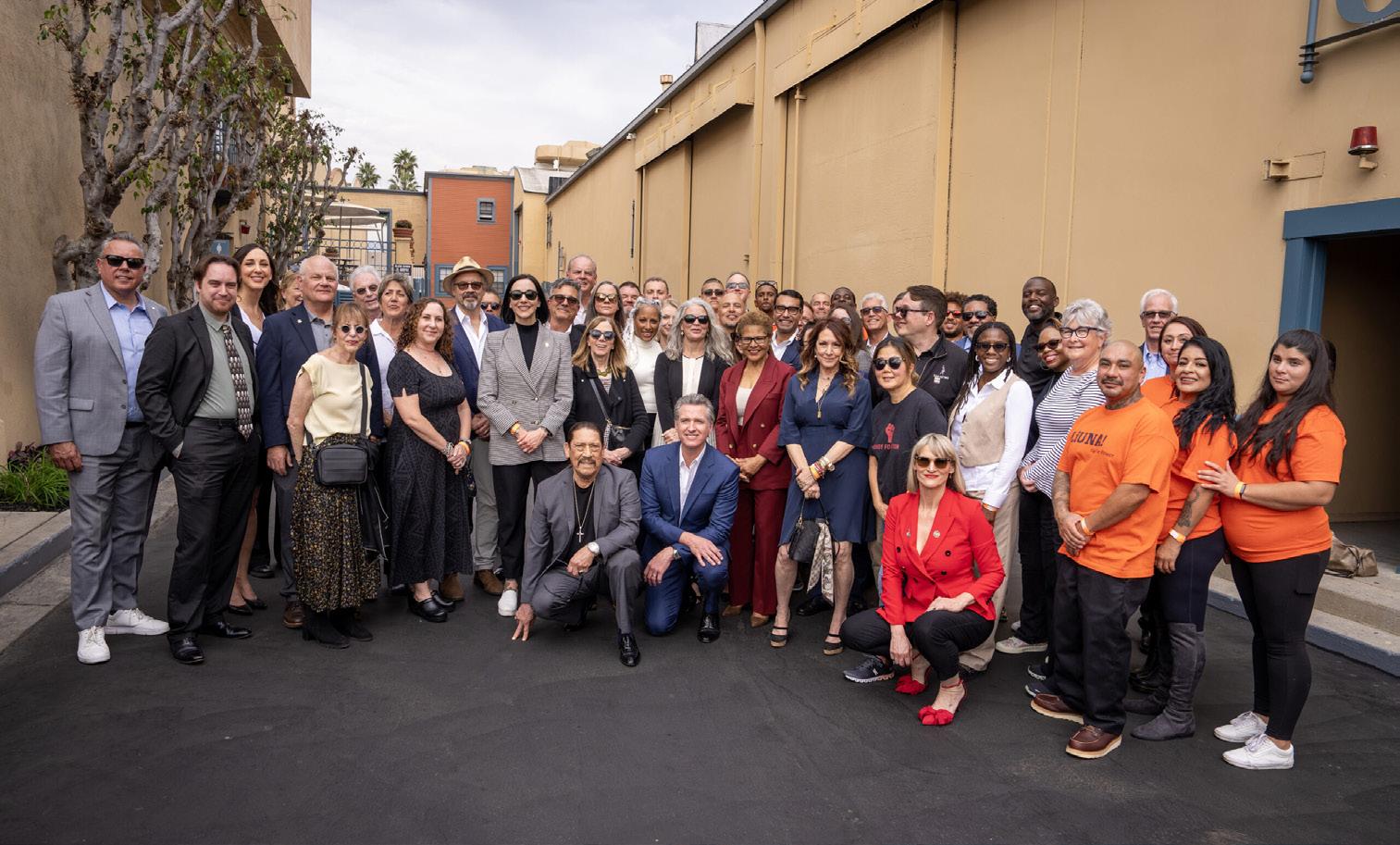 Gov. Gavin Newsom, kneeling in front next to the actor Danny Trejo, appears with industry union members and local officials. | Photo courtesy of the governor's office