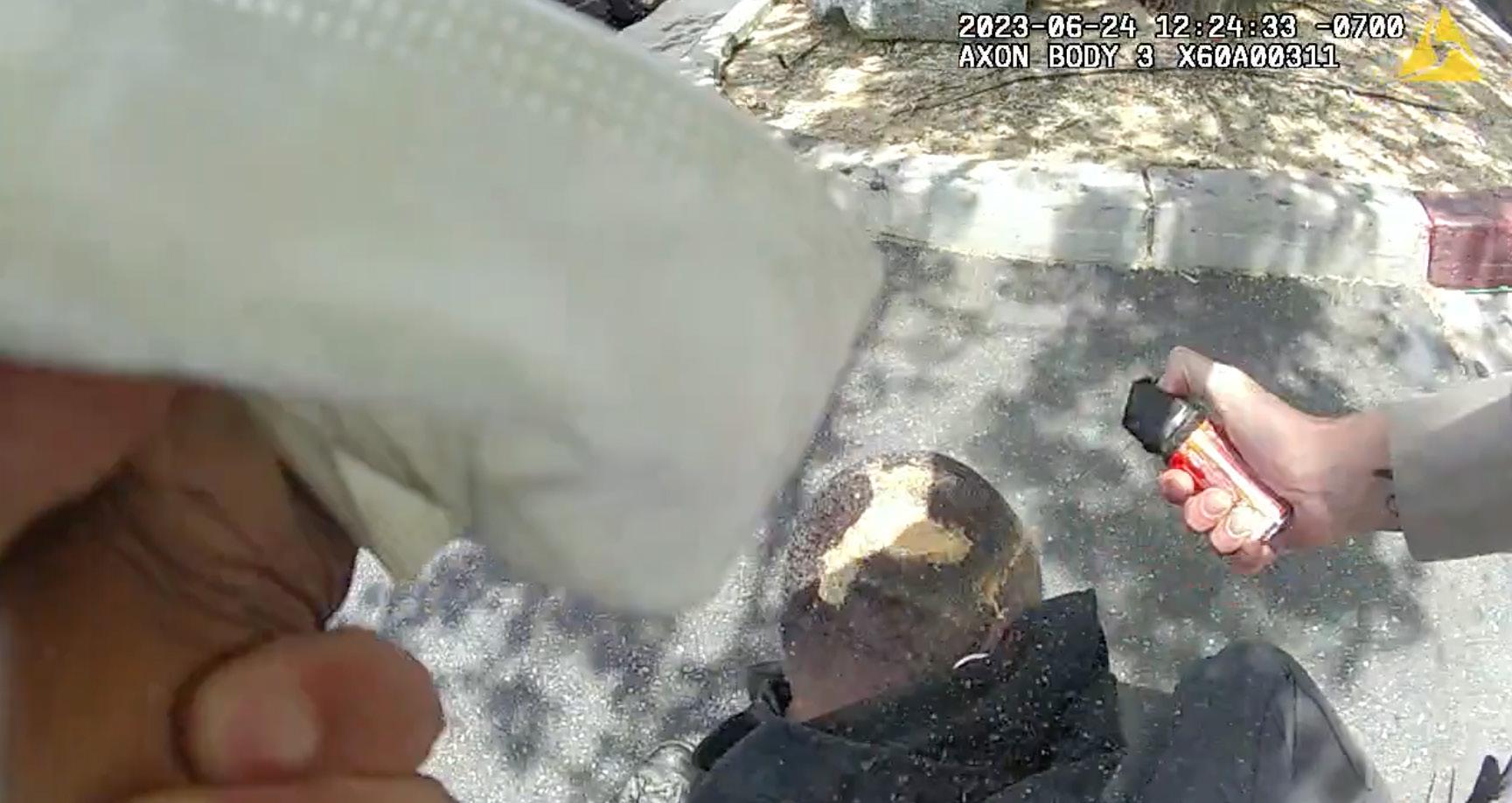Body-worn camera footage shows an Deputy Trevor James Kirk applying pepper spray to a woman outside a Lancaster grocery store. | Photo courtesy of the Los Angeles County Sheriff's Department