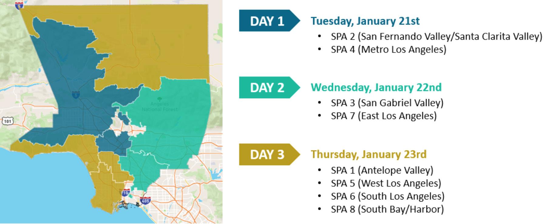 On Jan. 21, count volunteers will cover the San Fernando Valley and LA Metro areas. Day two takes place in the San Gabriel Valley and East LA, and on Jan. 23 volunteers will cover the Antelope Valley, West and South LA and