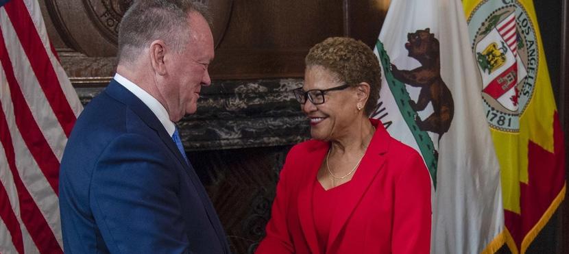Mayor Karen Bass and Jim McDonnell shake hands last month when she announced his selection as the next LAPD chief. | Photo courtesy of the city of Los Angeles