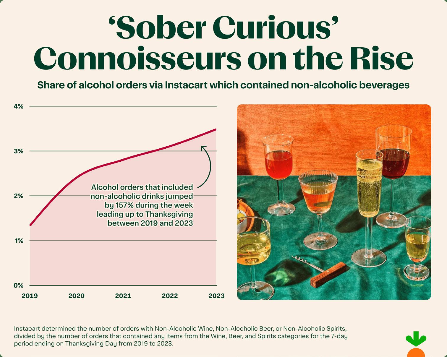 year plan to indulge in alcoholic beverages and 8% will opt for nonalcoholic beer or wine with dinner. Instacart purchase data confirms that nonalcoholic drink purchases are on the rise: Between 2019 and 2023, alcohol orders that included