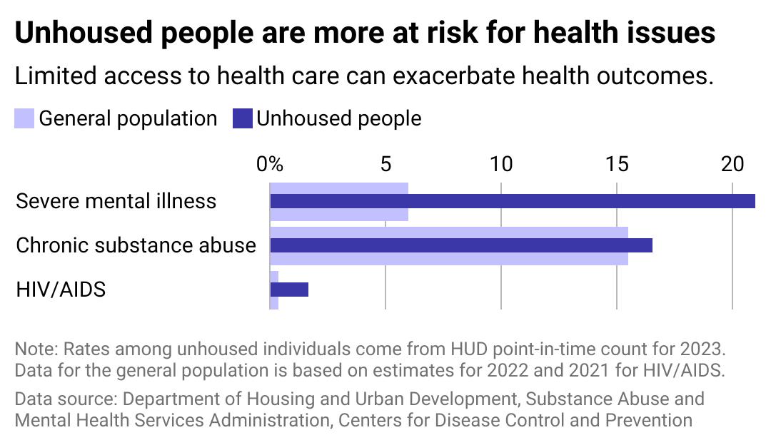 Some of the health risks from cold winters, air pollution in dense cities, and extreme heat may seem obvious, but internal and chronic health conditions also fuel shorter life expectancies for unhoused people.