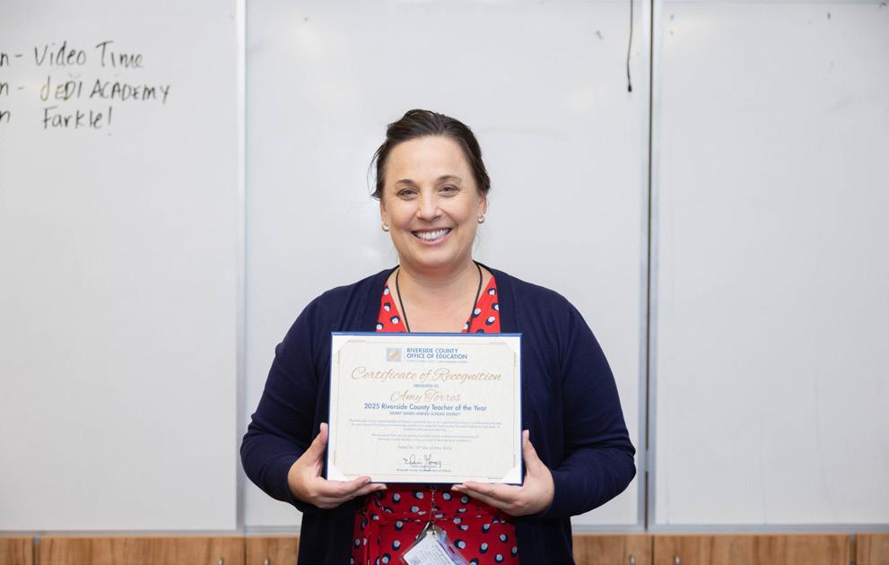 Amanda Zonker displays her 2024 Teacher of the Year award. | Photo courtesy of the Riverside County Office of Education