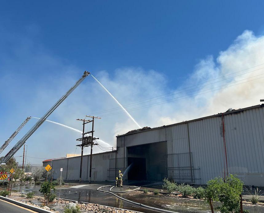 | Photo courtesy of the Riverside County Department of Environmental Health A firefighter on a ladder applies water to the roof of a vegetable packing plant in Coachella. | Photo courtesy of the Riverside County Fire Department/X