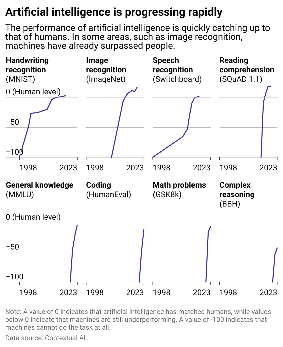 One way to track the development of artificial intelligence systems is to see how well the tech has performed on benchmark tests over time. Researchers at Contextual AI tracked the performance of several AI systems on a diverse group
