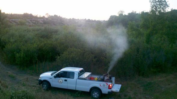 tion Agency. Pesticides are emitted as a mist dispersed from machines anchored in the backs of pickup trucks. Marcotte recommended that during operations, residents stay indoors and keep windows closed until at least 15 minutes after the trucks have departed.